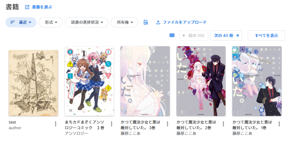 こんな感じでアップロードできれば成功です(一番左が私のテストファイル)。後は普通の電子書籍を見る感覚で、自分の本を読むことができます。iPhoneやMACを使っている方は、「ブック」というappがデフォルトで入っているので、そっちでもいいと思います。