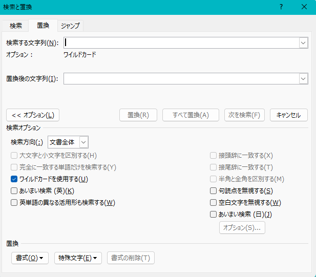 wordの置換機能を使って、上を下に置き換えます。なお、文頭のカギ括弧も一括で下がってしまうので、